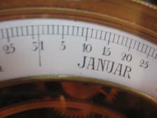 Kalendarium im unteren Teil der Uhr, vor der Pendellinse