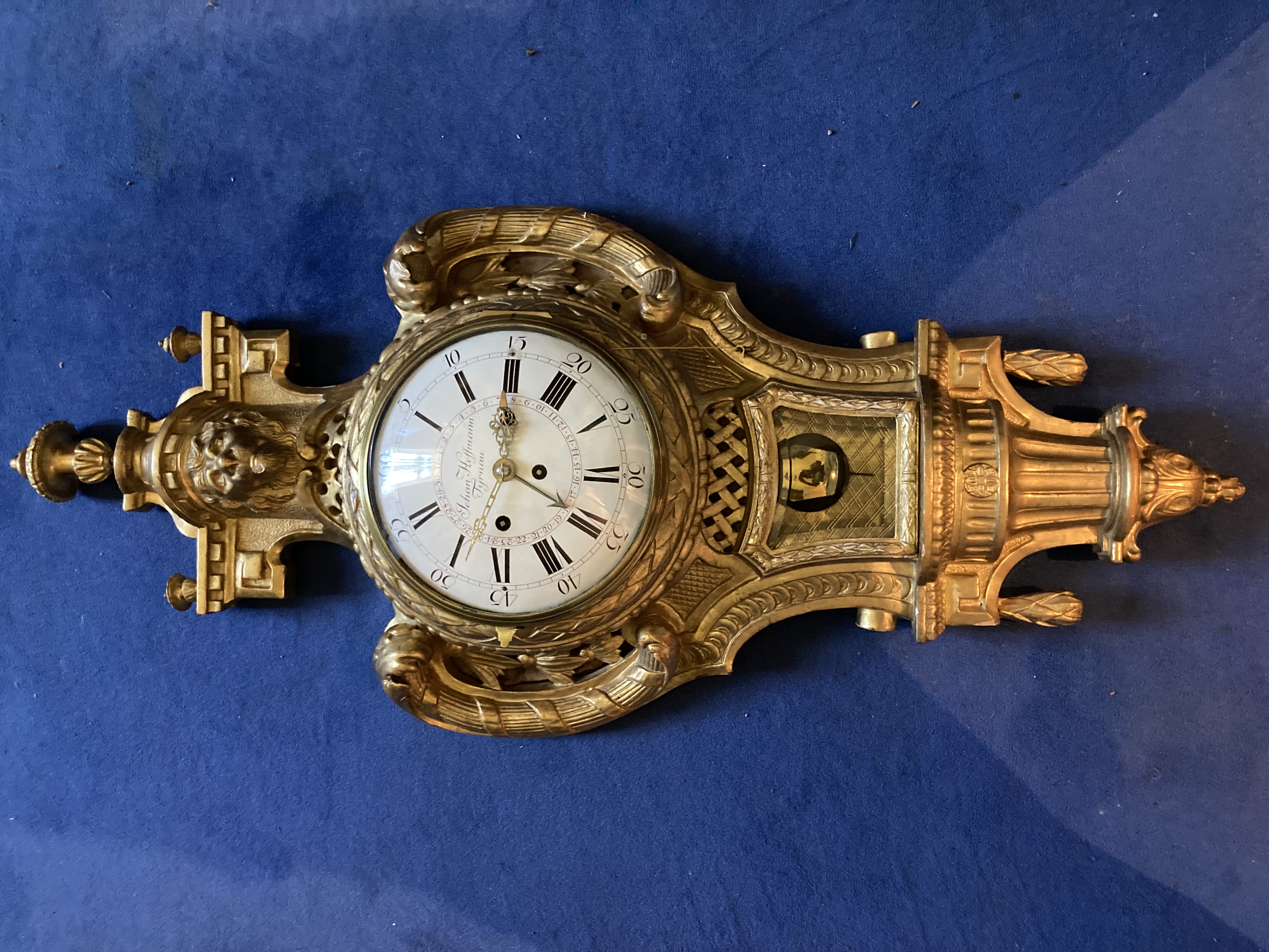 Stunden- und Minutenanzeige, Datumsanzeige Repetition, durch Zugseil rechts Schlagabschaltung Hebel oberhalb "1" Wiener 4/4-Stundenschlag auf 2 Glocken Hebel links oberhalb "11" |